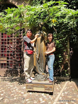 只是這戀情得不到善終的悲情女主角,現在竟變成了愛神的化身,夫妻、情侶來這裡像茱麗葉雕像宣示忠貞的愛情──男右女左與雕像合照,男方將手放在茱麗葉的右胸,代表著以茱麗葉對愛情的忠誠和付出,同樣對待身旁的女伴。有些年輕男生羞澀的把手放在胸部上方,這樣怎麼夠呢!只見家父大手一握,老倆口笑開懷,只是我爸的笑中帶有什麼意味我就無從得知啦……