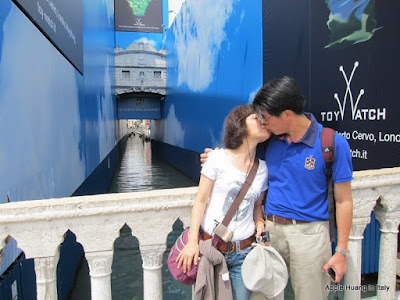 提到了「情定日落橋」,一定要說到電影中的傳說:愛侶在日落時分於嘆息橋下接吻,便可以天長地久。這座日落橋又叫「嘆息橋(Ponte dei Sospiri)」,將總督宮(Palazzo Ducale)和相鄰的地牢連結著,因為被審判而鋃鐺入獄的犯人到此,忍不住發出一聲嘆息得名。可惜我們到訪之時嘆息橋仍然在整修中,只能看到擬真的圖像,想耍個浪漫的老爸還是堅持要來個親親,也在一堆堆外國遊客面前展現我們亞洲民族的愛情也是火辣辣呀!
